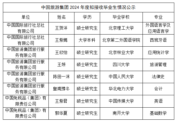 根據(jù)人力資源和社會保障部《關(guān)于做好2024年高校畢業(yè)生接收備案、報到上崗及材料審核等工作的通知》要求,現(xiàn)對我集團在京企業(yè)擬接收2024年度應(yīng)屆畢業(yè)生情況進行公示。