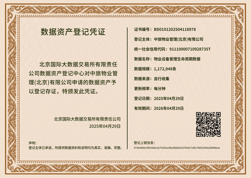 5月9日,經(jīng)北京國際大數(shù)據(jù)交易所(北數(shù)所)合規(guī)審核,中旅資產(chǎn)成功獲得“物業(yè)設(shè)備全生命周期”數(shù)據(jù)資產(chǎn)登記憑證。本次獲得登記憑證的“物業(yè)設(shè)備全生命周期”數(shù)據(jù)集,涵蓋設(shè)備采購、運行監(jiān)測、維護保養(yǎng)、報廢處置等全流程數(shù)據(jù),形成設(shè)備狀態(tài)、能耗分析、故障預警等維度,為物業(yè)行業(yè)數(shù)據(jù)要素市場化提供了可復制的實踐方案。這是中旅資產(chǎn)落實國家數(shù)據(jù)要素市場化配置改革、響應國資委數(shù)字化轉(zhuǎn)型戰(zhàn)略的重要突破,標志著其數(shù)據(jù)資源正式轉(zhuǎn)化為數(shù)據(jù)資產(chǎn),在合規(guī)管理與價值釋放方面取得實質(zhì)性進展。