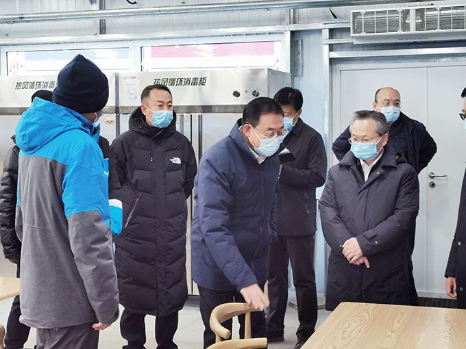在中旅酒店冬奧項目組后勤保障組及餐飲組負(fù)責(zé)人的陪同下,嚴(yán)鵬程副省長及賈凱副部長視察了駐地環(huán)境、員工餐廳、員工宿舍及急救應(yīng)急配套設(shè)施。后勤保障組負(fù)責(zé)人就駐地選址、建設(shè)和功能配置情況進(jìn)行了綜合匯報,詳細(xì)介紹了團隊駐地關(guān)于紅綠區(qū)防疫管控要求的落實情況。