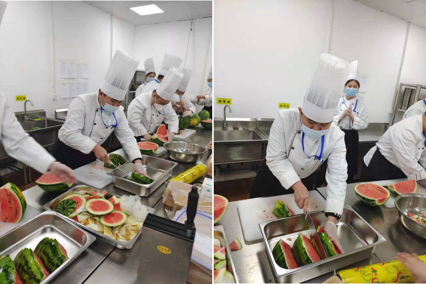 隨著冬奧會的臨近,人員也陸續(xù)到崗,除了李進(jìn)曉和另一位骨干是熟手外,其余的2名基層員工、16名實(shí)習(xí)生都是沒什么經(jīng)驗(yàn)的,這時(shí)候前期寫的菜單說明就派上了用場。為了讓大家盡快熟悉菜品的制作,培訓(xùn)成了每天的常態(tài)工作。李師傅又開始對員工進(jìn)行一次次的培訓(xùn)。從食材的選擇到調(diào)料的配比,從加工制作的方法到最終出品的要求,每個(gè)環(huán)節(jié)、每個(gè)要點(diǎn)都耐心講解,遇到培訓(xùn)學(xué)員不甚明白的也是不厭其煩的解釋。為了檢驗(yàn)學(xué)員的成果,李進(jìn)曉會隨時(shí)“考試”,拿起一個(gè)器皿就問“這是干什么用的?”又或者提一個(gè)汁醬名就問“需要什么材料?”“什么配比?”再或者說一個(gè)水果就問“上原果還是要切配?”“怎么清洗?”“消毒水是什么配比?”“怎么切?”如此反復(fù),學(xué)員就會繃緊弦,認(rèn)真的記,反復(fù)的操練,直到達(dá)到要求為止。他的理念是:做菜馬虎不得,為冬奧做菜更是玩不得半點(diǎn)虛的,一定要付出最大的責(zé)任心,飽含熱愛,才能讓客人在品嘗美味同時(shí),感受被重視的幸福感,這樣做出來的菜品才是成功的。