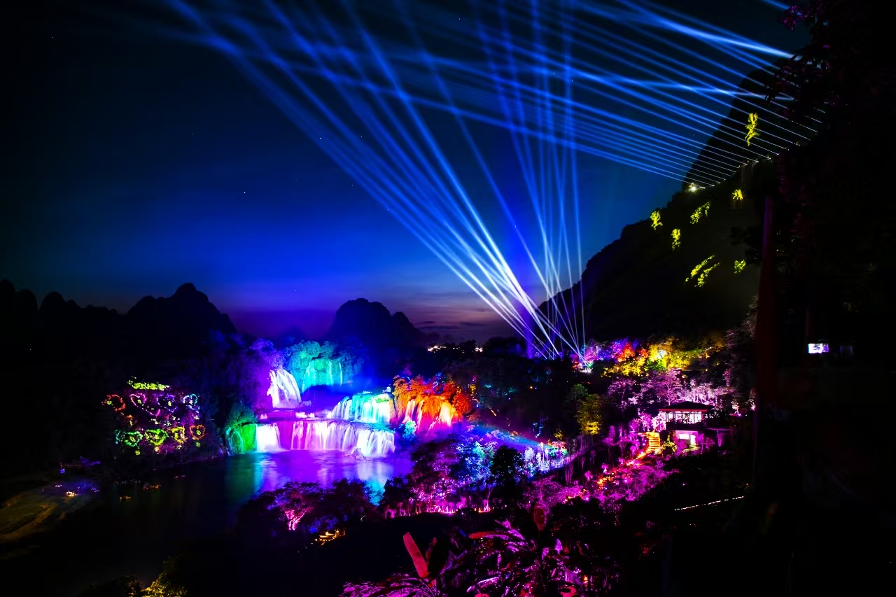 景區(qū)傾力打造亞洲首個(gè)沉浸式跨國夜游互動體驗(yàn)項(xiàng)目--“奇妙?夜德天”,游客可從高空棧道俯瞰德天瀑布夜景,欣賞璀璨燈光下瀑布的磅礴氣勢,也能近距離感受燈光與水幕的完美交融,獲得身臨其境的體驗(yàn),實(shí)現(xiàn)“一夜德天,一瀑兩國”的沉浸式體驗(yàn)。