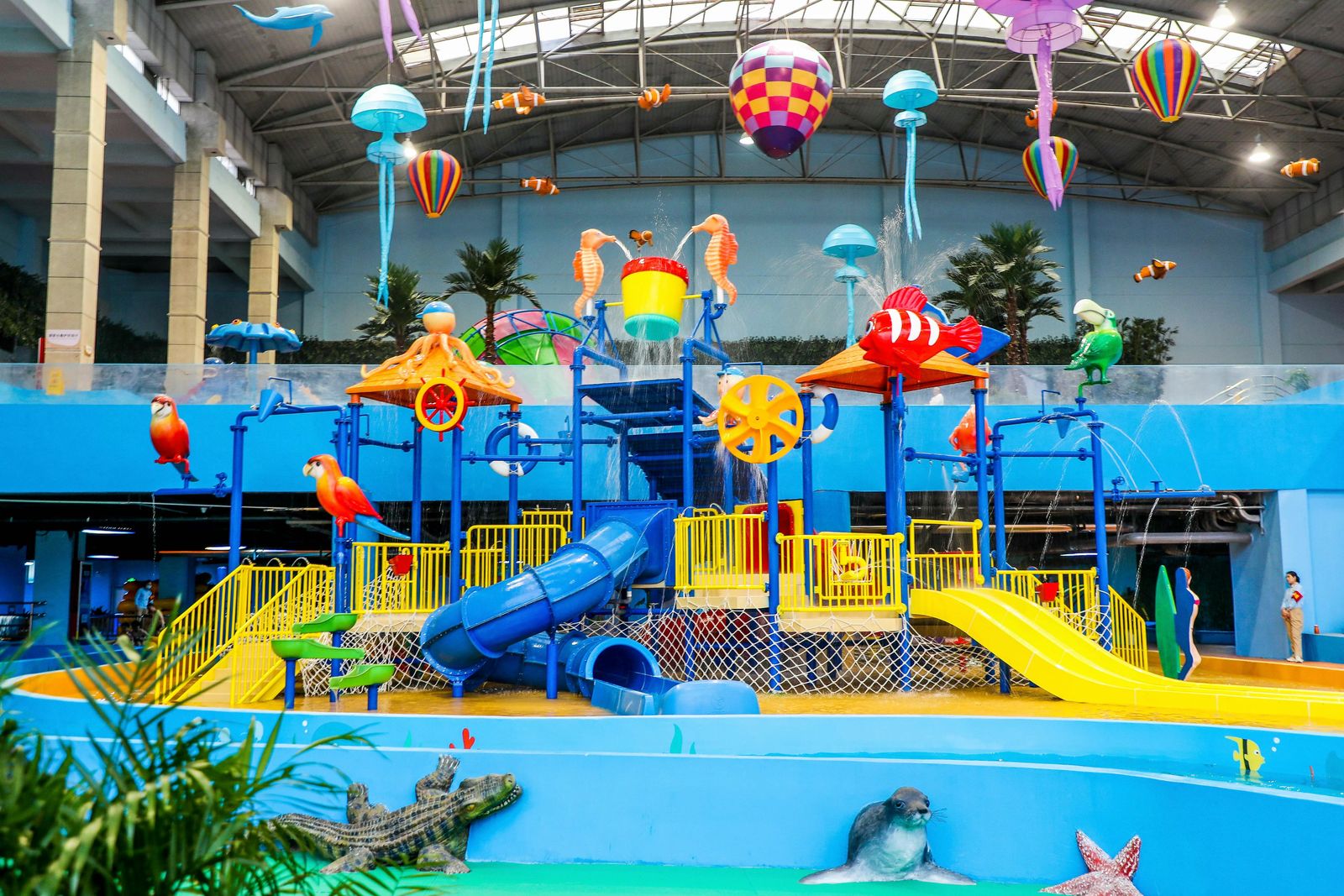 海泉寶貝親子樂(lè)園位于海泉灣都市娛樂(lè)溫泉二樓,運(yùn)營(yíng)面積2600平米,項(xiàng)目空間結(jié)合歐洲建筑及紋樣元素,同時(shí)以IP海洋生物元素為主題貫穿整個(gè)空間場(chǎng)景內(nèi),主要設(shè)施有:職業(yè)體驗(yàn)小超市、機(jī)器人大戰(zhàn)、男女換裝、海洋生物觀賞區(qū)、小火車、旋轉(zhuǎn)木馬、沙屋、車站、勇士之城淘氣堡、書城、派對(duì)屋。應(yīng)用現(xiàn)代兒童游樂(lè)場(chǎng)的設(shè)計(jì)手法及理念,重塑海泉灣品牌形象。擁有適合兒童身心發(fā)育需求的機(jī)動(dòng)類、換裝體驗(yàn)類、手工類以及軟式淘氣堡四大類兒童游樂(lè)設(shè)備,打造出創(chuàng)意空間、海泉之旅、智慧屋、勇士之城四大機(jī)動(dòng)游玩區(qū)域,具有真正的文化+教育+親子+游樂(lè)的理念,延續(xù)文化與教育的同時(shí),讓每個(gè)家庭能享受并沉浸其中,體驗(yàn)不一樣的親子游玩空間。小朋友可以在這里玩耍,結(jié)交朋友,了解有趣的知識(shí),學(xué)習(xí)體驗(yàn)生活常識(shí),與爸爸媽媽共同完成有趣的游戲任務(wù),度過(guò)童話般的快樂(lè)時(shí)光。